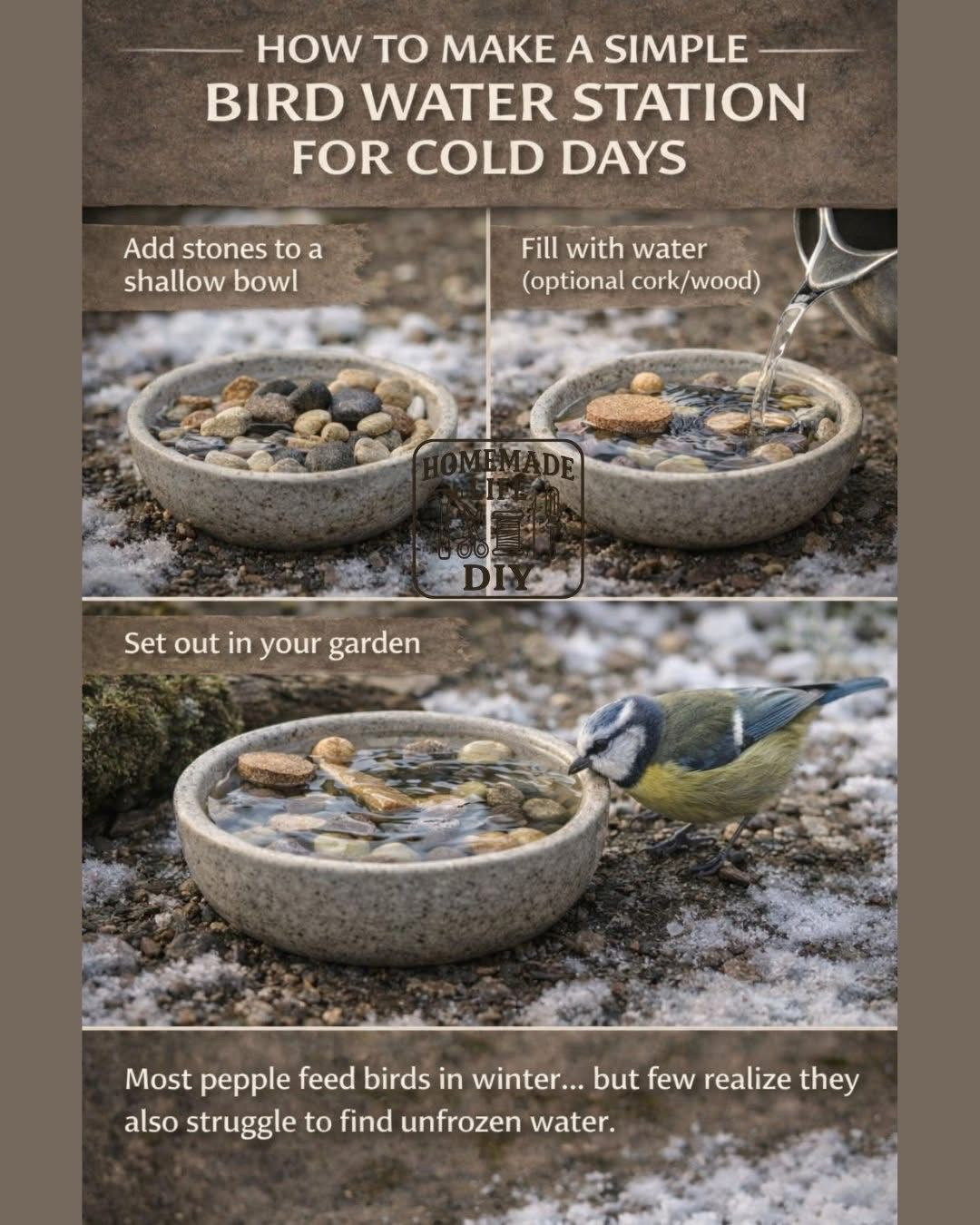 Fill the lid with a layer of pebbles so that it's weighted down and will stay put. Set the garbage can lid on top of a stump in your yard or on top of a terra cotta flowerpot. Fill the lid with water, and wait for all those birdies!