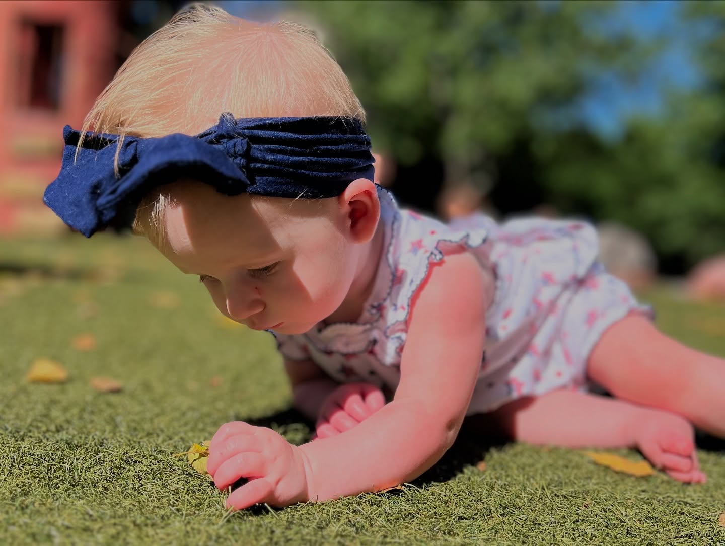 We’ve written previously about the sensory benefits of nature for children. This is true for babies too. Sensory play includes any activity that stimulates your young child’s senses: touch, smell, taste, movement, balance, sight, and hearing. Research shows that sensory play builds nerve connections in the brain’s pathways, which lead to the child’s ability to complete more complex learning tasks. Sensory play also supports language development, cognitive growth, fine and gross motor skills, problem-solving skills, and social interaction.