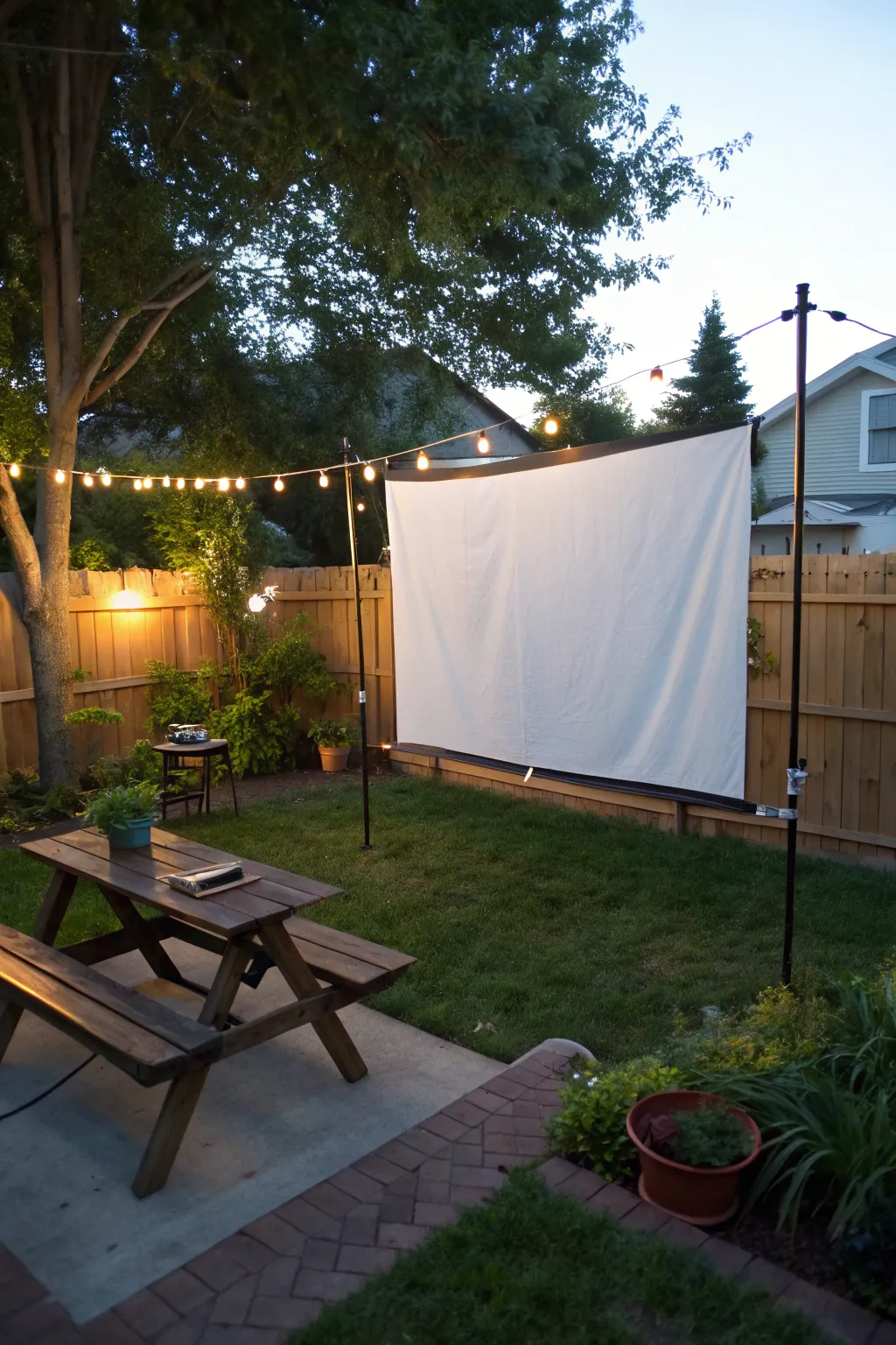 To set up an outdoor movie you’ll need a portable projector and some speakers. If you have a screen then great, otherwise you can use a wall, or hang a plain white sheet instead.